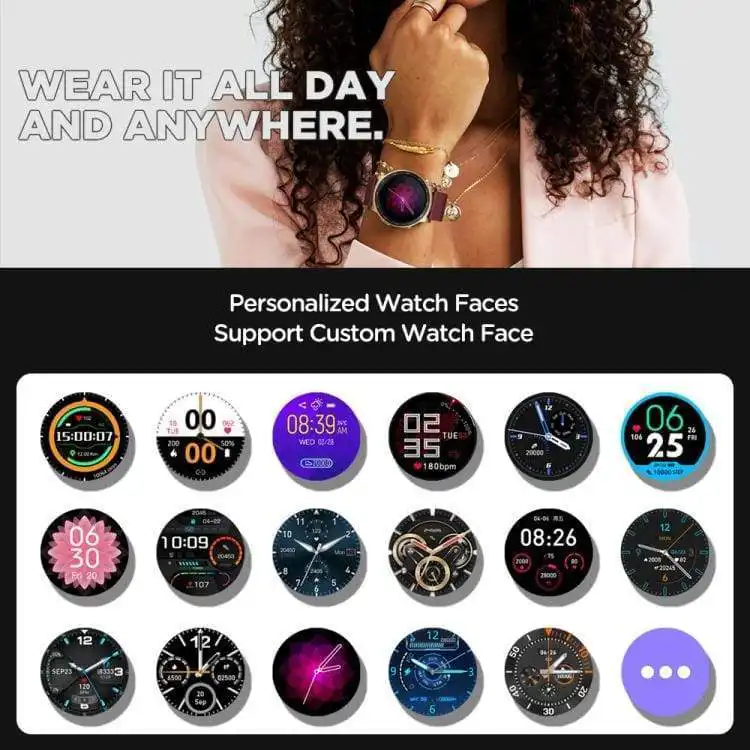 - Functions: time/date, alarm clock, timer, stopwatch, daily resting heart rate, abnormal heart rate alert, SpO2 level measurement, blood pressure monitoring, sleep score and insight, calorie burn tracking, Smart notifications, weather, control music, find my phone, find my watch, do not disturb, mobile reminder, pedometer, Sedentary reminder, automatic goals, calories burned, real-time pace & distance, sports modes, Message and call notifications, Phone call answering/speakerphone