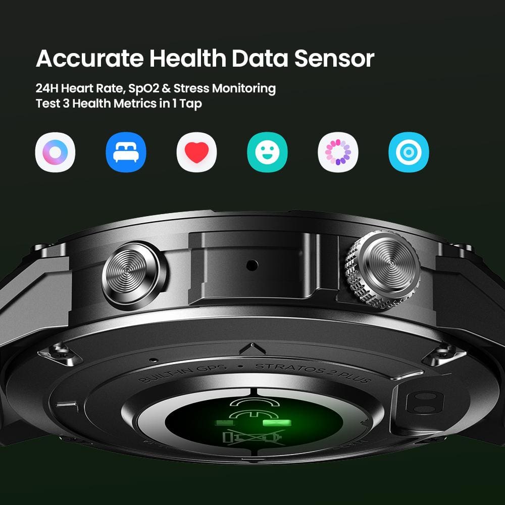 Monitor your health and wellness with the Stratos 2 Plus. It features a wrist heart rate monitor and a pulse oximeter to track your blood oxygen saturation levels. With 3ATM water resistance, you can confidently wear it during swims and other water activities.