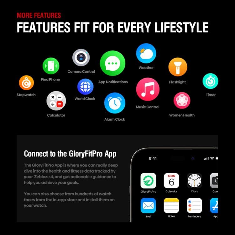 - Lifestyle Features: Bluetooth Phone Calls, Voice Assistant, Controls Smartphone Music and Camera, Phone Call Notifications, SMS Notifications, App Notifications, Find My Phone, World clock, Time/Date, GPS Time Sync, Automatic Daylight Saving Time, Stopwatch, Timer, Alarm Clock, Weather Sync, Flashlight, Calculator, Password Setting, Raise to Wake, Power Saving Modes, Do Not Disturb Modes, AOD Modes, Screen Locked Modes, Slient Modes